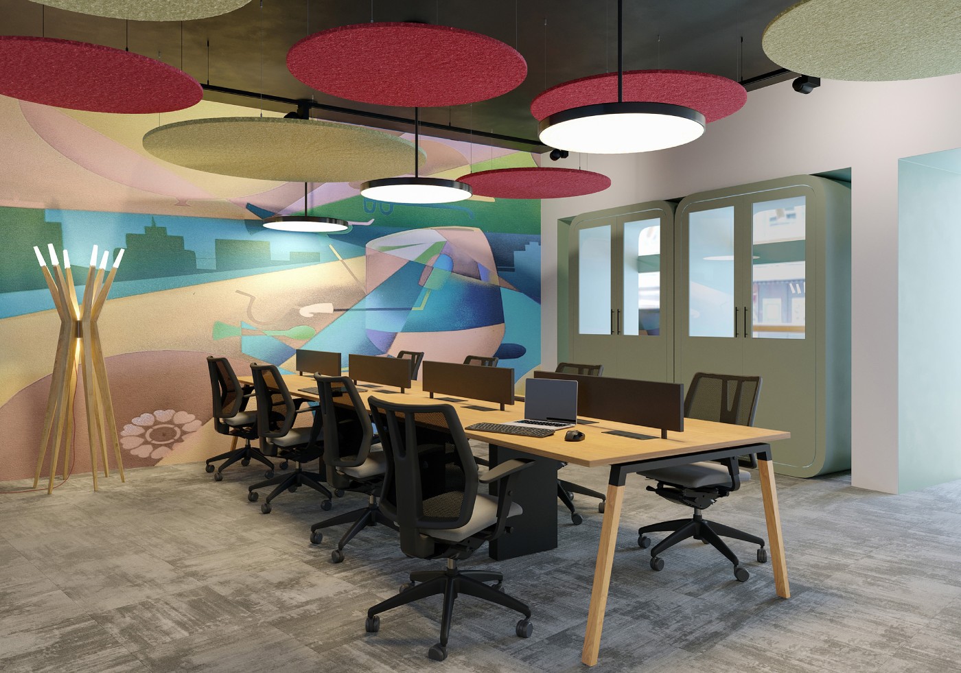 Soluções como cabines de privacidade, painéis acústicos e divisórias modulares ajudam a criar “bolhas de concentração” sem quebrar a sensação de amplitude.