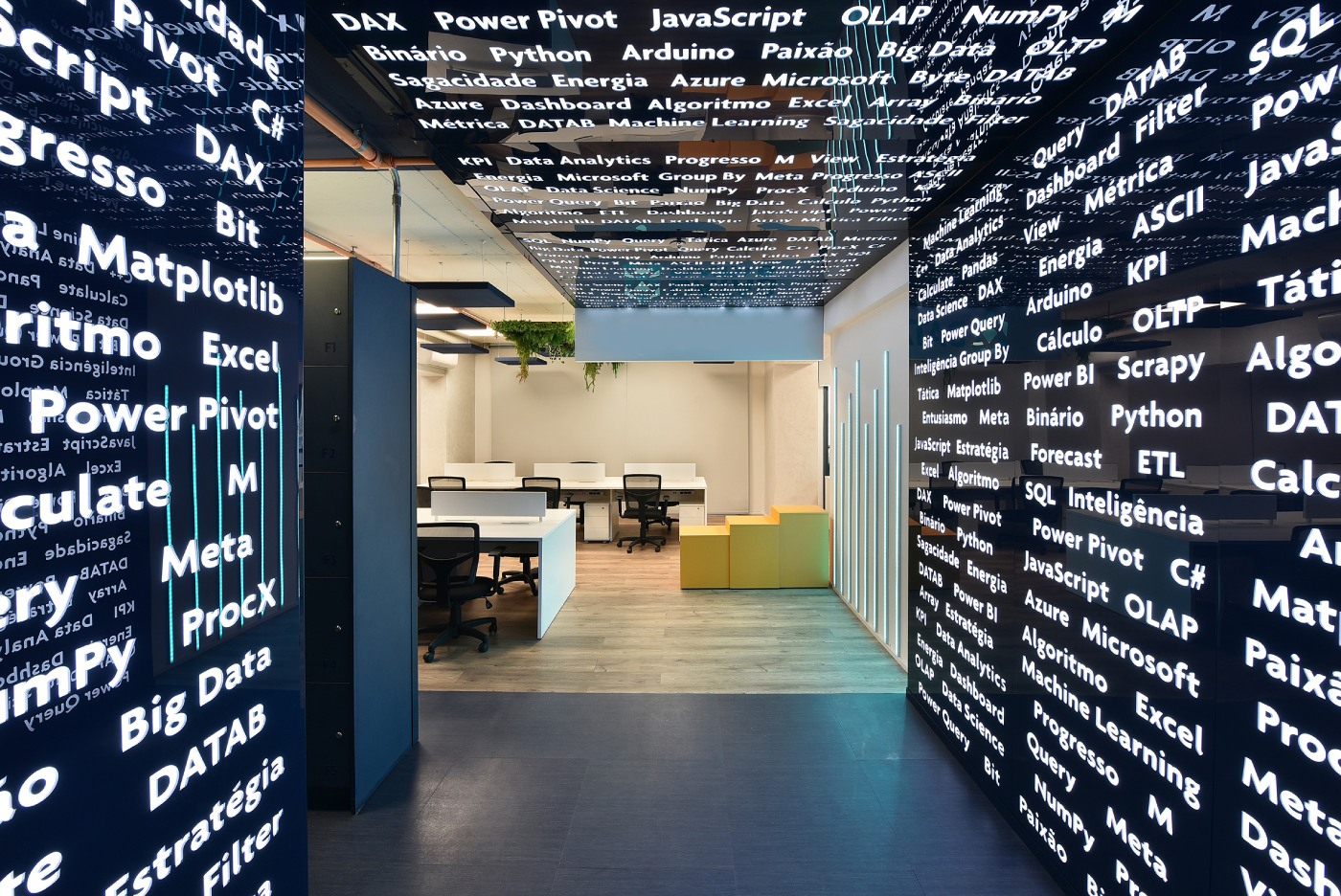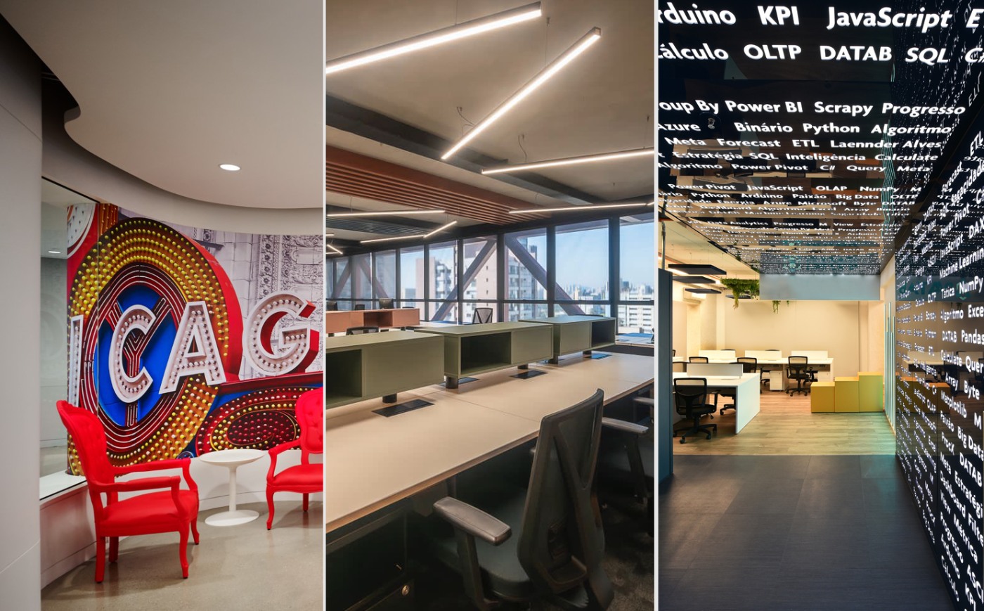 Análise: A linguagem de tecnologia foi incorporada ao projeto corporativo, alinhando com a identidade da marca e com o visual minimalista do edifício. O mobiliário escolhido também apresenta linhas retas e visual mais minimalista, acompanhando a narrativa do projeto.