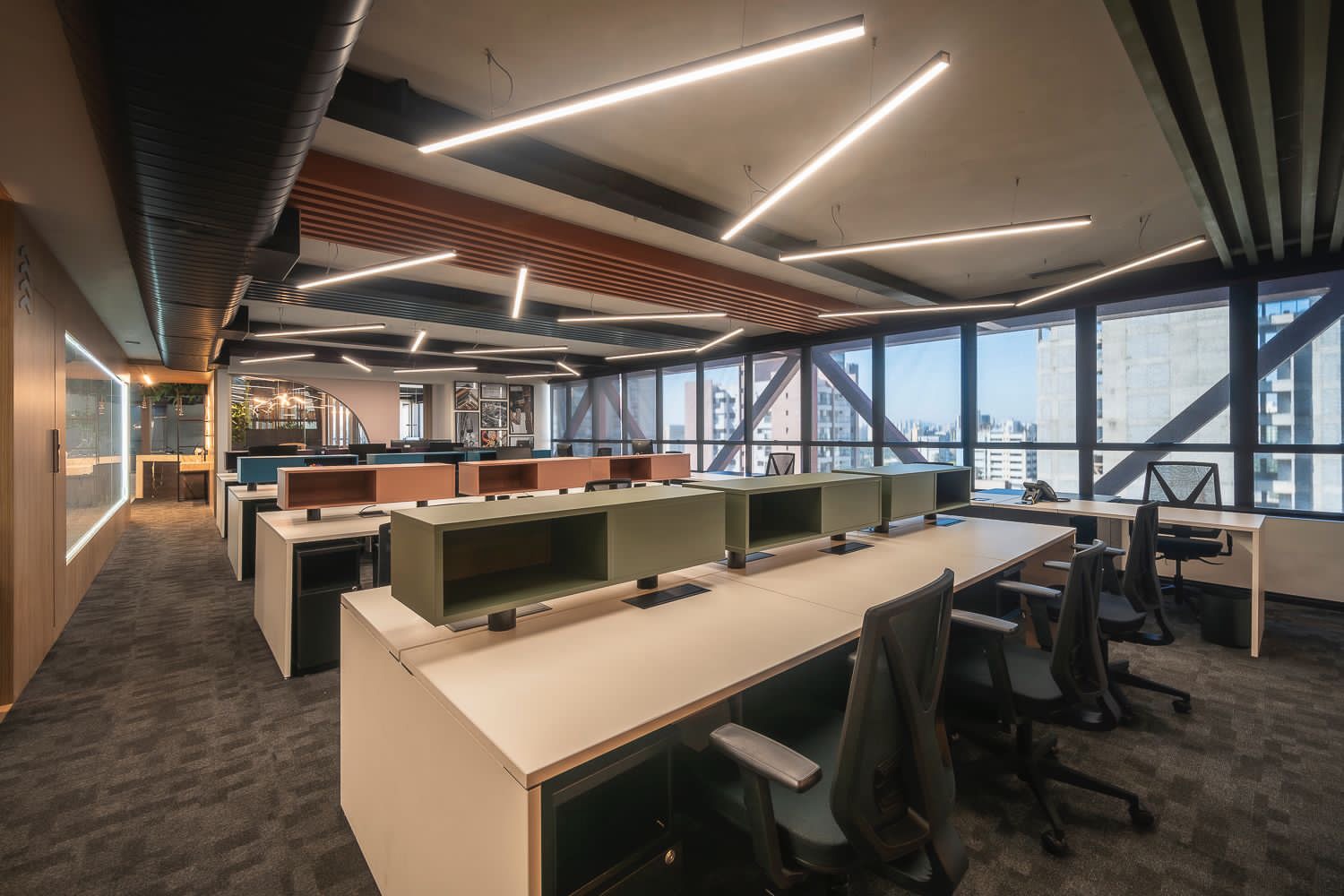 Análise: Foi realizado nesse projeto um alinhamento da identidade da marca com a arquitetura do prédio, que possui colunas inclinadas nas janelas e estrutura mais brutalista. A parte interna manteve o teto aparente com a inserção de vigas de madeira para preencher alguns espaços. O mobiliário foi escolhido pensando principalmente na ergonomia dos colaboradores, com cadeiras plenamente ajustáveis. Além de pensar nas necessidades de armários para as demandas das atividades.