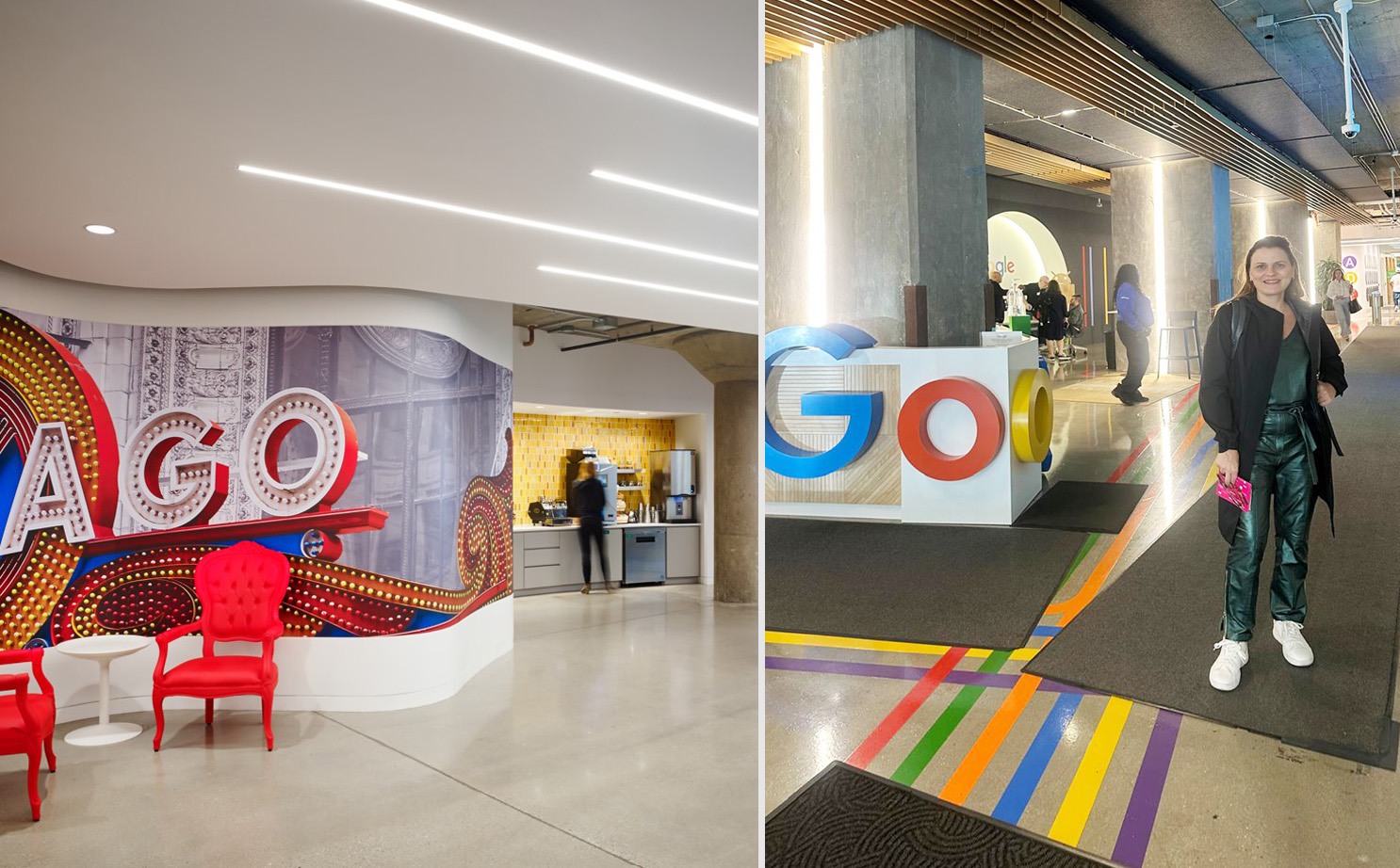 Análise: A CEO da RS Design visitou o escritório do Google em Chicago e pode verificar como o projeto alinhou tanto a identidade da marca, quanto o perfil dos colaboradores, a arquitetura do prédio e o dinamismo da própria cidade. O projeto atendeu todas as narrativas para fortalecer a imagem do próprio Google.